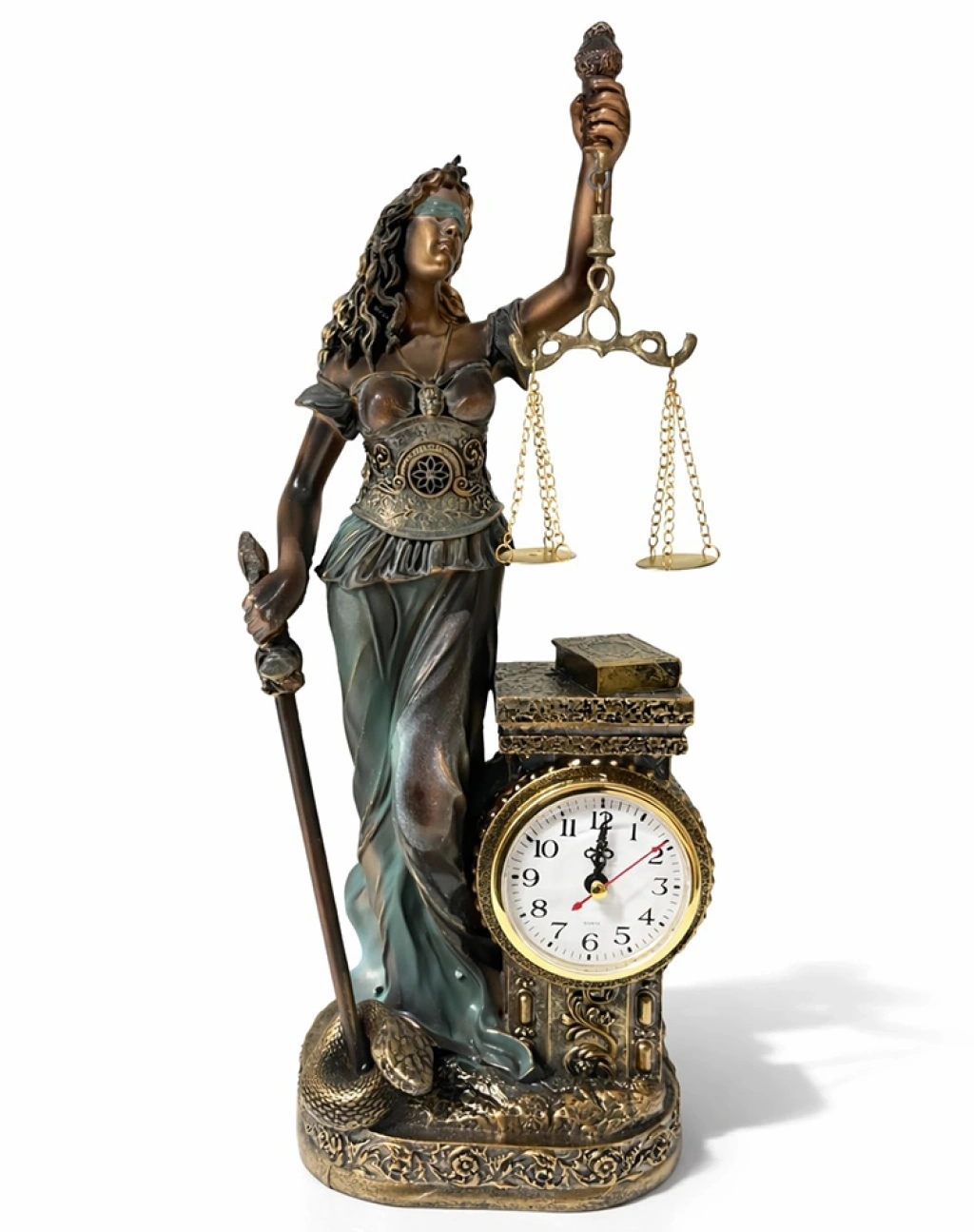 15X10 CM POLYESTER SAATLİ ADALET FİGÜRÜ Ürün ÖzellikleriPolyester Saatli Adalet Figürü, klasik adalet sembolünü kompakt ve dekoratif bir saat tasarımıyla bir araya getiren şık bir masa aksesuarıdır. 15x10 cm ölçüsündeki ideal boyutu sayesinde ofis masası, kitaplık ve çalışma alanlarında fazla yer kaplamadan estetik bir görünüm sunar. Elinde terazi tutan adalet figürü detayı ile güçlü bir adalet sembolü vurgusu oluştururken, alt bölümde yer alan saat kısmı ürüne fonksiyonel bir özellik kazandırır. Hem dekoratif hem kullanışlı yapısıyla masa düzenine zarif bir dokunuş sağlar. Dayanıklı polyester malzeme yapısı sayesinde uzun süreli kullanım sunar. Hukuk büroları, avukat ofisleri ve kurumsal çalışma alanları için anlamlı bir ofis dekor ürünü ve şık bir hediye alternatifi olarak tercih edilebilir.Ürün Teknik Özellikleri Özellik Açıklama Ürün Adı Polyester Saatli Adalet Figürü 15x10 Cm Malzeme Polyester Ölçü 15 x 10 cm Tasarım Adalet figürü ve entegre masa saati Kullanım Alanı Ofis, hukuk bürosu, masa üstü dekorasyon Paket İçeriği1 adet Polyester Saatli Adalet Figürü (15x10 cm)