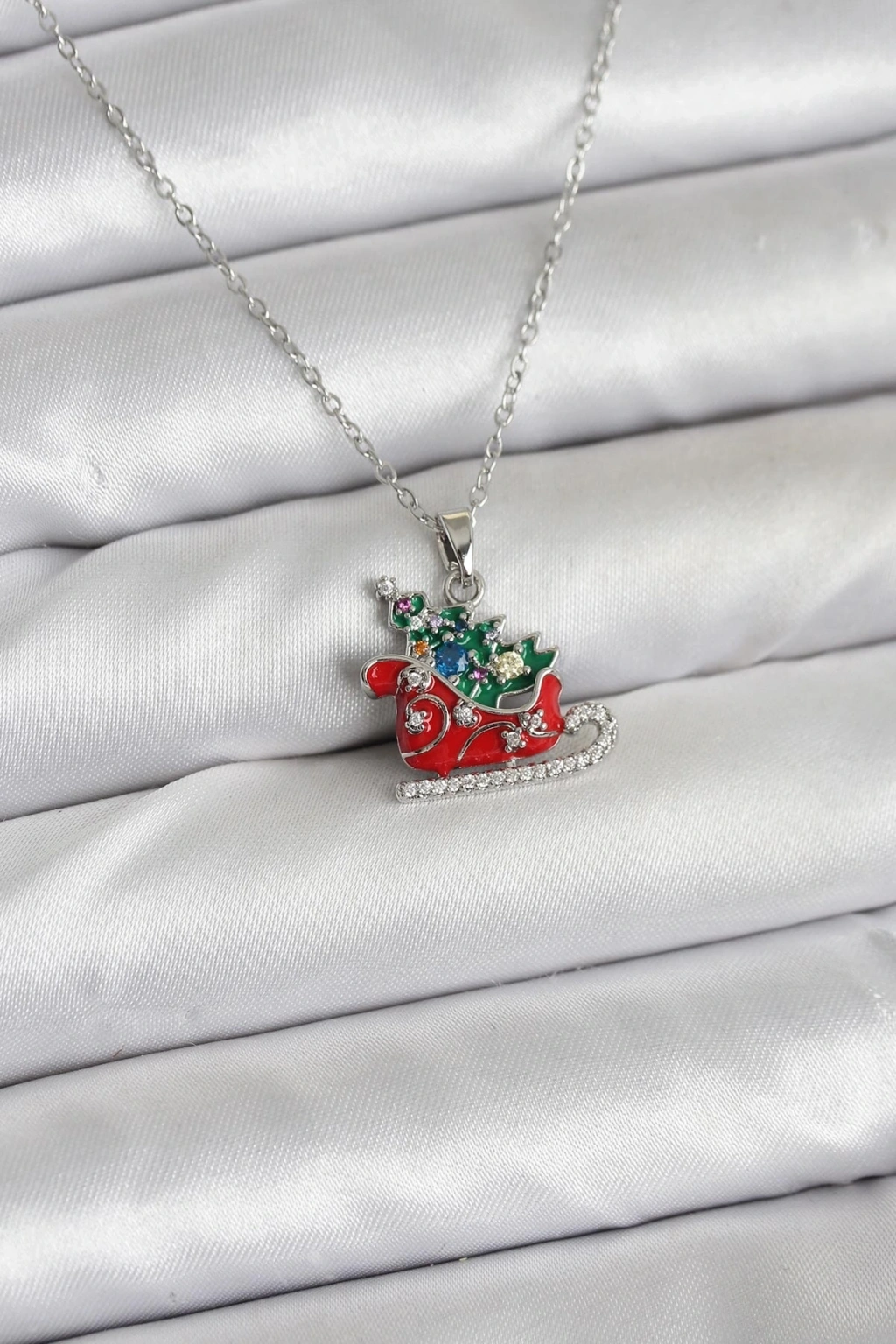 316l Çelik Zincir Gümüş Renk Kızak Ve Çam Ağacı Figürlü Yılbaşı Temalı Kadın Kolye