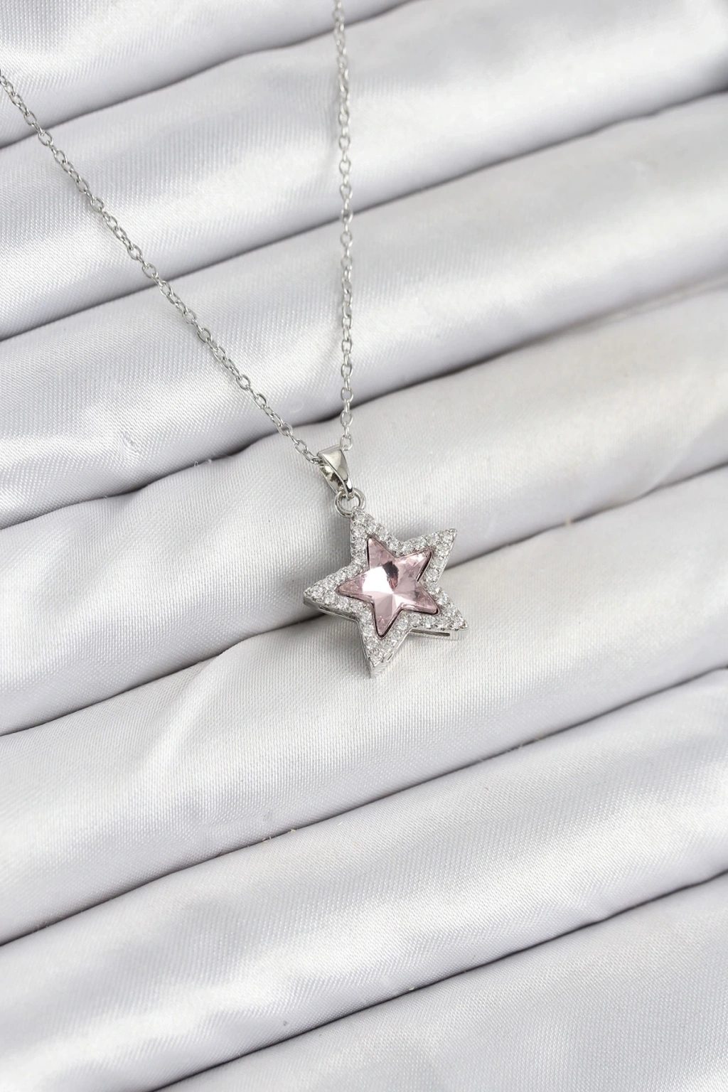 316L Çelik Zincir Gümüş Renk Pembe Taşlı Yıldız Model Kadın Kolye