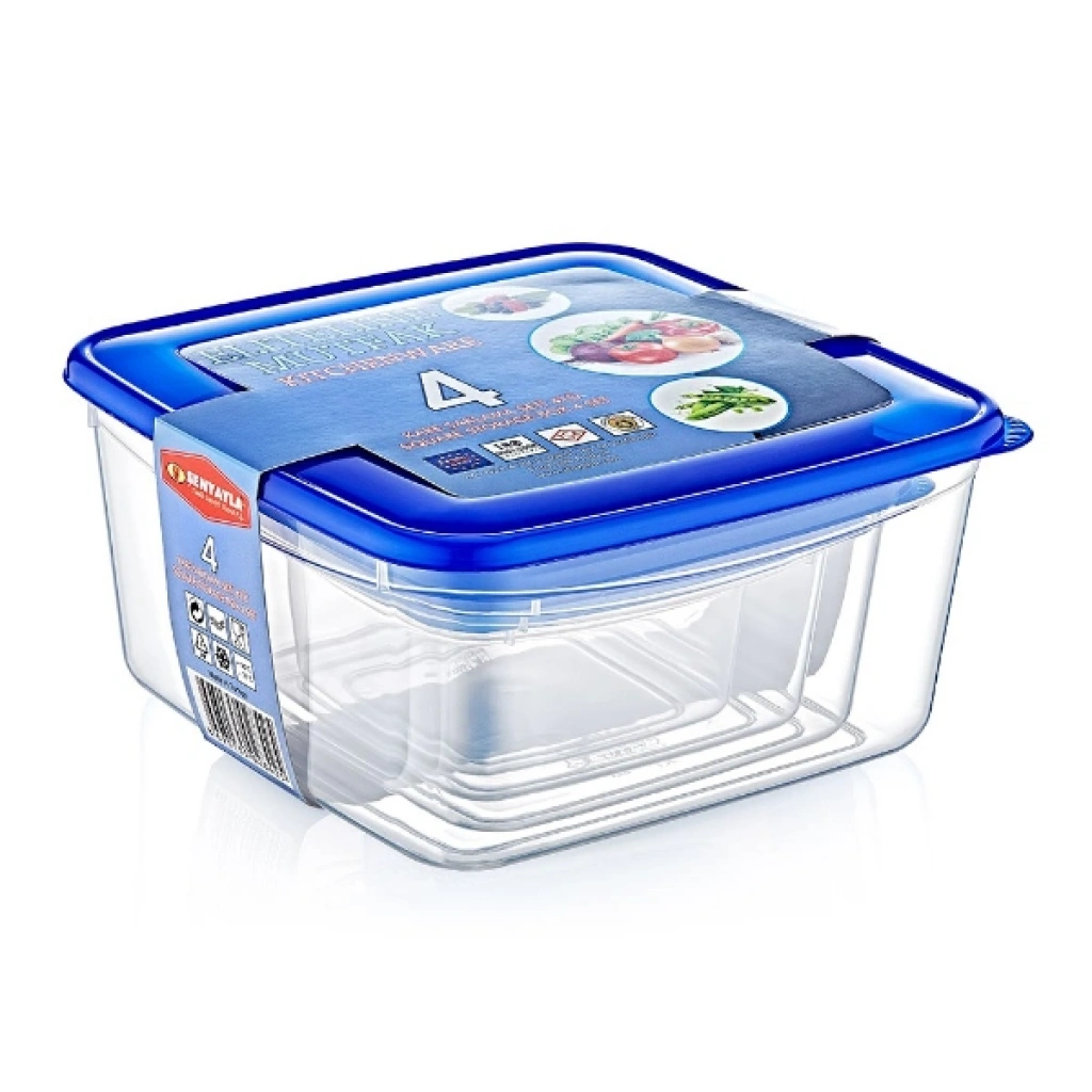 4'LÜ KARE SAKLAMA KABI SETİÜrün ÖzellikleriMutfakta pratiklik ve düzen isteyenler için tasarlanan 4'lü Kare Saklama Kabı Seti, farklı boyutlardaki kaplarıyla çok yönlü bir saklama kabı seti çözümü sunar. Set içerisinde dört adet kare formda kap bulunur ve gıdalarınızı düzenli şekilde muhafaza etmenize yardımcı olur. Şeffaf gövde tasarımı sayesinde içerik kolayca görülebilir ve dolap içi düzen daha kontrollü hale gelir. Sızdırmaz mavi kapakları, hava geçişini minimuma indirerek yiyeceklerin tazeliğini korumaya destek olur. Dayanıklı ve BPA içermeyen plastik malzemeden üretilmiş olup gıda ile temasa uygundur. Buzdolabında, mutfak dolaplarında ya da pikniklerde güvenle kullanılabilen kare saklama kabı tasarımı, alanı verimli kullanmanızı sağlar. İç içe geçebilen yapısı sayesinde yer tasarrufu sunar ve yemek, meyve, sebze, salata, kahvaltılık veya kuru gıdalar için hijyenik bir gıda saklama çözümü oluşturur.Ürün Teknik Özellikleri Özellik Açıklama Ürün Adı 4'lü Kare Saklama Kabı Seti Adet 4 Parça Set Malzeme BPA içermeyen plastik Kapak Özelliği Sızdırmaz mavi kapak Kullanım Alanı Buzdolabı, mutfak dolabı ve piknik kullanımı Paket İçeriği4 adet kare saklama kabı