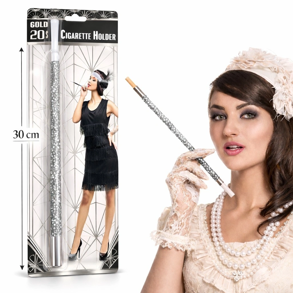 GÜMÜŞ PAYETLİ SİGARA TUTACAĞIÜrün ÖzellikleriGümüş Payetli Sigara Tutacağı, 1920’ler temalı parti ve organizasyonlar için tasarlanmış şık ve dikkat çekici bir kostüm aksesuarıdır. 30 cm uzunluğundaki ideal ölçüsü sayesinde elde zarif bir duruş sağlar ve kombinlere nostaljik bir hava katar. Gümüş renkli payet kaplama tasarımı ışık altında parlayarak sahne, fotoğraf çekimi ve konsept etkinliklerde etkileyici bir görünüm oluşturur. Özellikle Gatsby temalı davetler için tercih edilen gümüş sigara tutacağı, kostüm partilerinde stilinizi tamamlayan iddialı bir detay sunar. Uzun ve ince formu ile estetik bir kullanım sağlayan 1920ler parti aksesuarı, vintage konsept kombinlerin vazgeçilmez tamamlayıcısıdır. Gösterişli ve dekoratif yapısıyla öne çıkan payetli sigara tutacağı, eğlenceli organizasyonlar için ideal bir tercihtir.Ürün Teknik Özellikleri Özellik Açıklama Ürün Adı Gümüş Payetli Sigara Tutacağı Uzunluk 30 cm Renk Gümüş Tasarım Payet Kaplama Kullanım Alanı 1920'ler Temalı Partiler ve Kostüm Organizasyonları Paket İçeriği1 Adet Gümüş Payetli Sigara Tutacağı