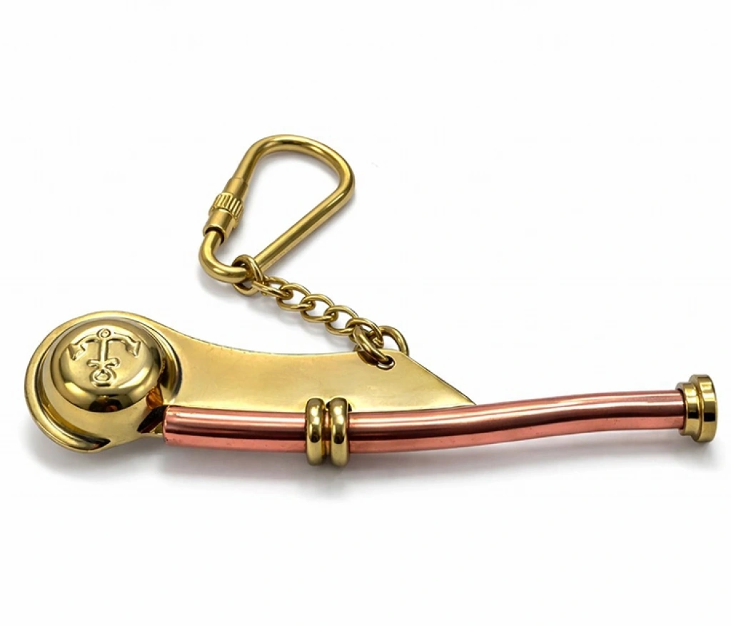 PİRİNÇ SİLİSTRE DÜDÜĞÜ ANAHTARLIK Ürün ÖzellikleriDenizcilik tarihinin en ikonik simgelerinden biri olan Silistre düdüğü, şimdi prestijli bir anahtarlık tasarımıyla cebinizde! Yüksek kaliteli pirinç ve bakır detaylarla üretilen bu özel anahtarlık, aslına sadık kalınarak tasarlanmış formuyla büyüleyici bir nostalji sunar. 12 cm toplam uzunluğa sahip olan bu ürün, sadece dekoratif bir obje değil, aynı zamanda net bir ses çıkarabilen fonksiyonel bir mini enstrümandır. Altın sarısı pirincin parıltısı ve bakırın sıcak tonu, ürüne otantik bir "deniz kurdu" havası katar. Güçlü metal zinciri ve güvenli vidalı klips mekanizması sayesinde anahtarlarınıza, teknenizin anahtar grubuna veya sırt çantanıza kolayca takılabilir. Deniz tutkunları, eski denizciler ve marin temalı aksesuar koleksiyonerleri için paha biçilemez bir hediye seçeneğidir. Her detayında işçilik barındıran bu pirinç silistre anahtarlık, stilinize karakteristik ve tarihsel bir derinlik kazandıracak.Ürün Teknik ÖzellikleriÖzellikAçıklamaMalzemeYüksek Kaliteli Pirinç ve Bakır AksamToplam Boyut12 cmFonksiyonSes Çıkarabilen Aktif Silistre DüdüğüTasarımGeleneksel Denizci Düdüğü (Bosun's Whistle)AparatVidalı Metal Klips ve Dayanıklı ZincirKullanım AlanıEv, Araba, Tekne Anahtarlığı, Çanta AksesuarıStilNostaljik, Marin, Profesyonel Denizci EkipmanıPaket İçeriği1 Adet Pirinç Silistre Düdüğü Anahtarlık