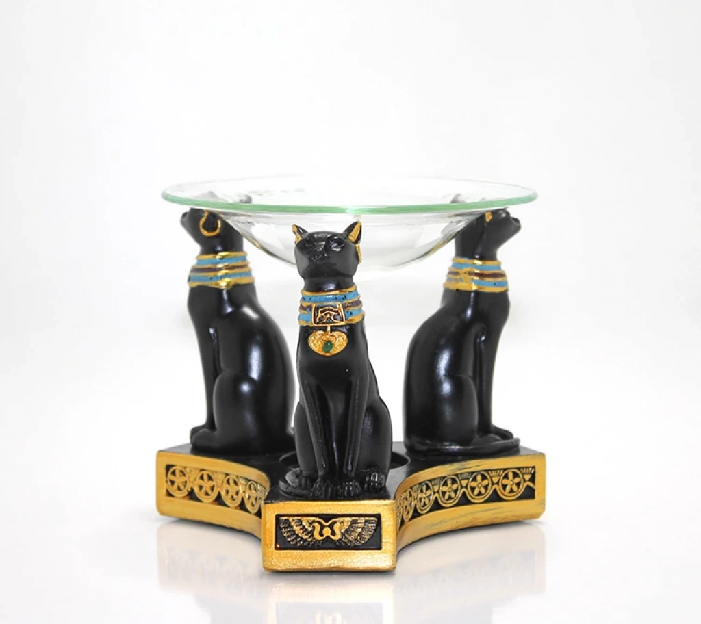 POLYESTER MISIR KEDİSİ BUHURDANLIKÜrün ÖzellikleriPolyester Mısır Kedisi Buhurdanlık, Antik Mısır’ın sembolik kedi figürlerini modern dekorasyonla buluşturan şık bir aromaterapi ürünüdür. 11x12 cm boyutundaki ideal ölçüsü sayesinde hem ev hem de iş yeri ortamlarında kolayca kullanılabilir. Üç adet detaylı Mısır kedisi figürünün taşıdığı cam hazne, ürüne hem estetik hem de mistik bir görünüm kazandırır. 1.derece kaliteli polyesterden üretilmiş olması sayesinde uzun ömürlü, sağlam ve ısıya dayanıklı bir kullanım sunar. Üst kısımda yer alan cam bölmeye uçucu yağ, esans yağı veya kokulu mum yağı eklenerek ortamda hoş ve kalıcı bir aroma yayılması sağlanır. Alt bölmeye yerleştirilen tealight mum ile birlikte kısa sürede verimli bir aromaterapi etkisi oluşturur. Etnik dekor sevenler, fark yaratan biblo tarzı buhurdanlık arayanlar ve yaşam alanına mistik bir dokunuş katmak isteyenler için ideal bir seçimdir.Paket İçeriği1 adet Polyester Mısır Kedisi Buhurdanlık