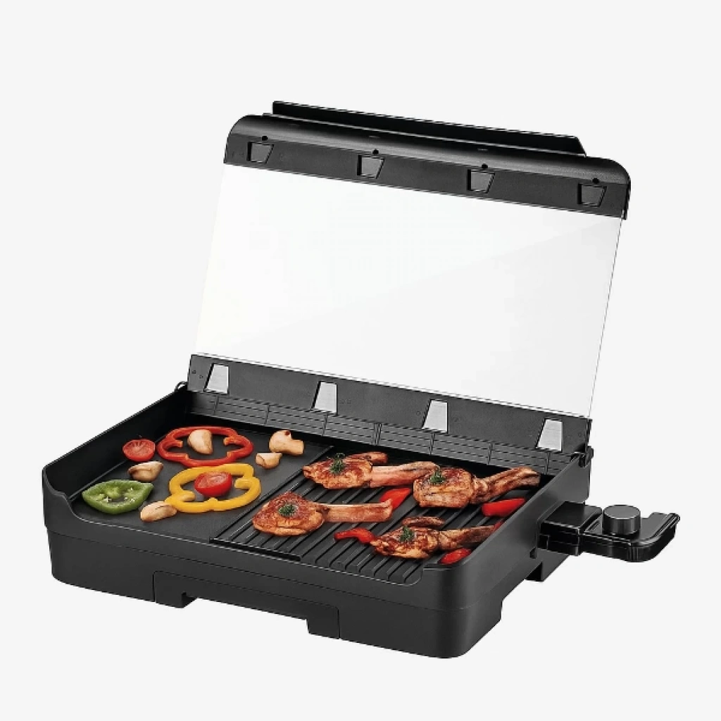 SİNBO ELEKTRİKLİ IZGARA CAM KAPAKLIÜrün ÖzellikleriModern mutfaklar için tasarlanan Sinbo Elektrikli Izgara Cam Kapaklı, kokusuz ve dumansız pişirme teknolojisiyle keyifli bir ızgara deneyimi sunar. 5 kademeli termostat ayarı sayesinde et, balık, sebze veya tost gibi farklı yiyecekleri ideal sıcaklıkta pişirmenize olanak tanır.Yanmaz yapışmaz alüminyum döküm gövdesi, yiyeceklerin yüzeye yapışmasını önleyerek kolay temizlik sağlar. Şeffaf cam kapağı sayesinde pişirme sürecini sürekli kontrol edebilir ve yemeklerin lezzetini kaybetmeden, eşit şekilde pişmesini sağlayabilirsiniz. Ayrıca kapağı sayesinde mutfağınızda oluşabilecek duman ve kokuları minimuma indirir.Isıya dayanıklı malzemelerden üretilen gövdesi uzun ömürlü kullanım sunarken, çıkarılabilir yağ tepsisi fazla yağı toplayarak hem daha sağlıklı hem de pratik bir pişirme sağlar. Kolay temizlenebilir yapısı ile kullanım sonrası temizlik işlemi oldukça zahmetsizdir. Sinbo’nun güvenilir teknolojisiyle üretilen bu elektrikli ızgara, hem lezzet hem de konfor arayan kullanıcılar için mükemmel bir seçimdir.Paket İçeriği1 adet Sinbo cam kapaklı elektrikli ızgara